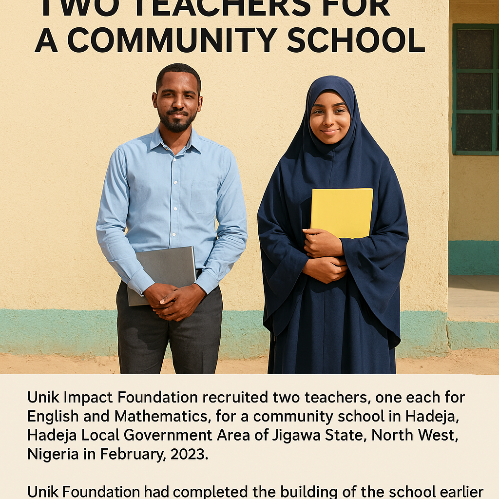 Unik Impact Foundation recruited two teachers, one each for English and Mathematics, for a community school in Hadeja, Hadeja Local Government Area of Jigawa State, North West, Nigeria in February, 2023.