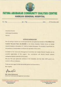 In keeping with our stated vision to provide opportunities for health to vulnerable, poor, and underserved peoples and communities, including health systems strengthening and local community resilience, Unik Impact Foundation supported the Fatima Abubakar Community Dialysis Centre in Hadejia General Hospital with a grant of 1.2 Million Naira only (3,300.00 USD)in 2019. This is to help subsidise the cost of investigations, consumables, and haemodialysis for the indigent patients (who would otherwise not afford) coming to the centre.